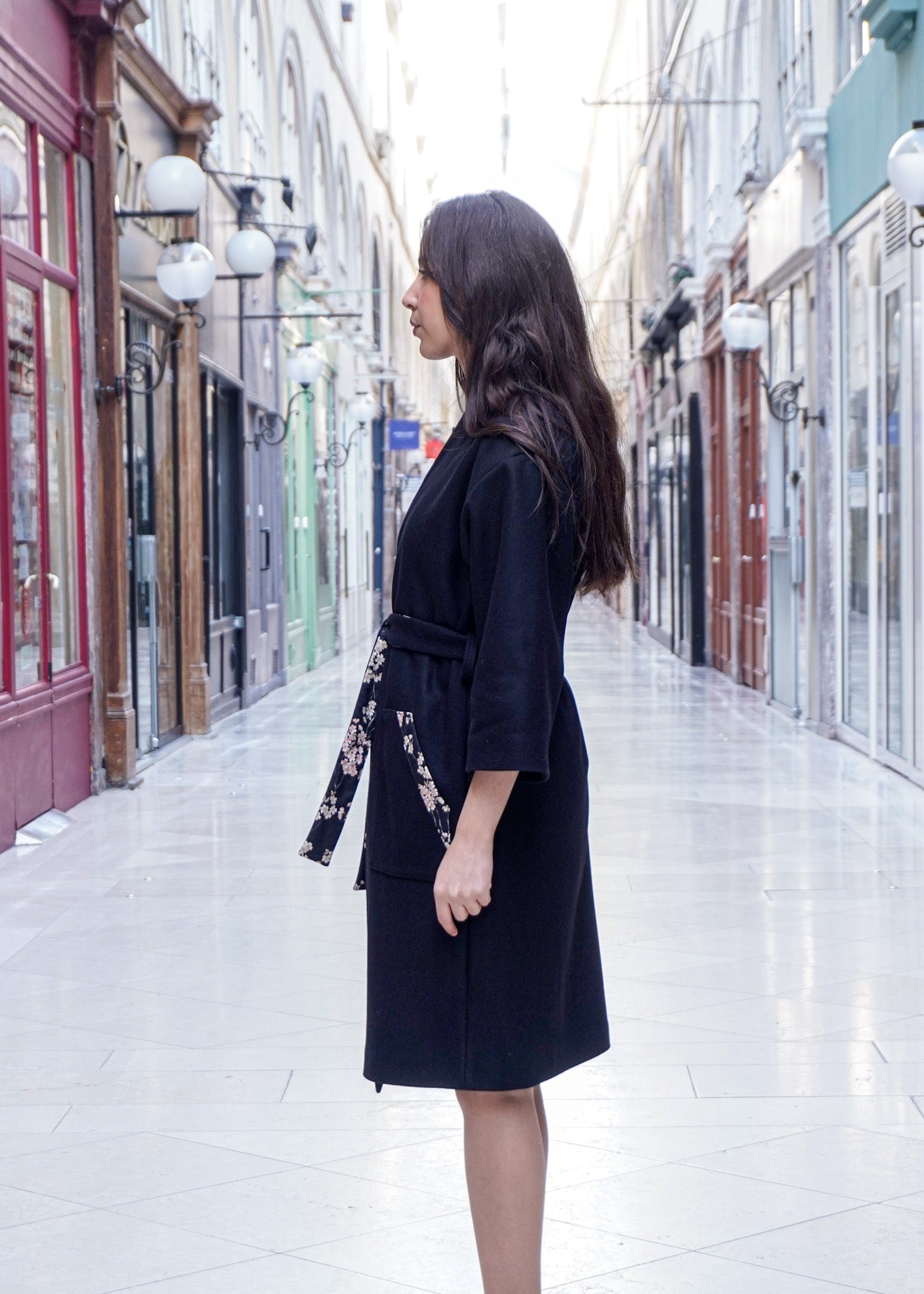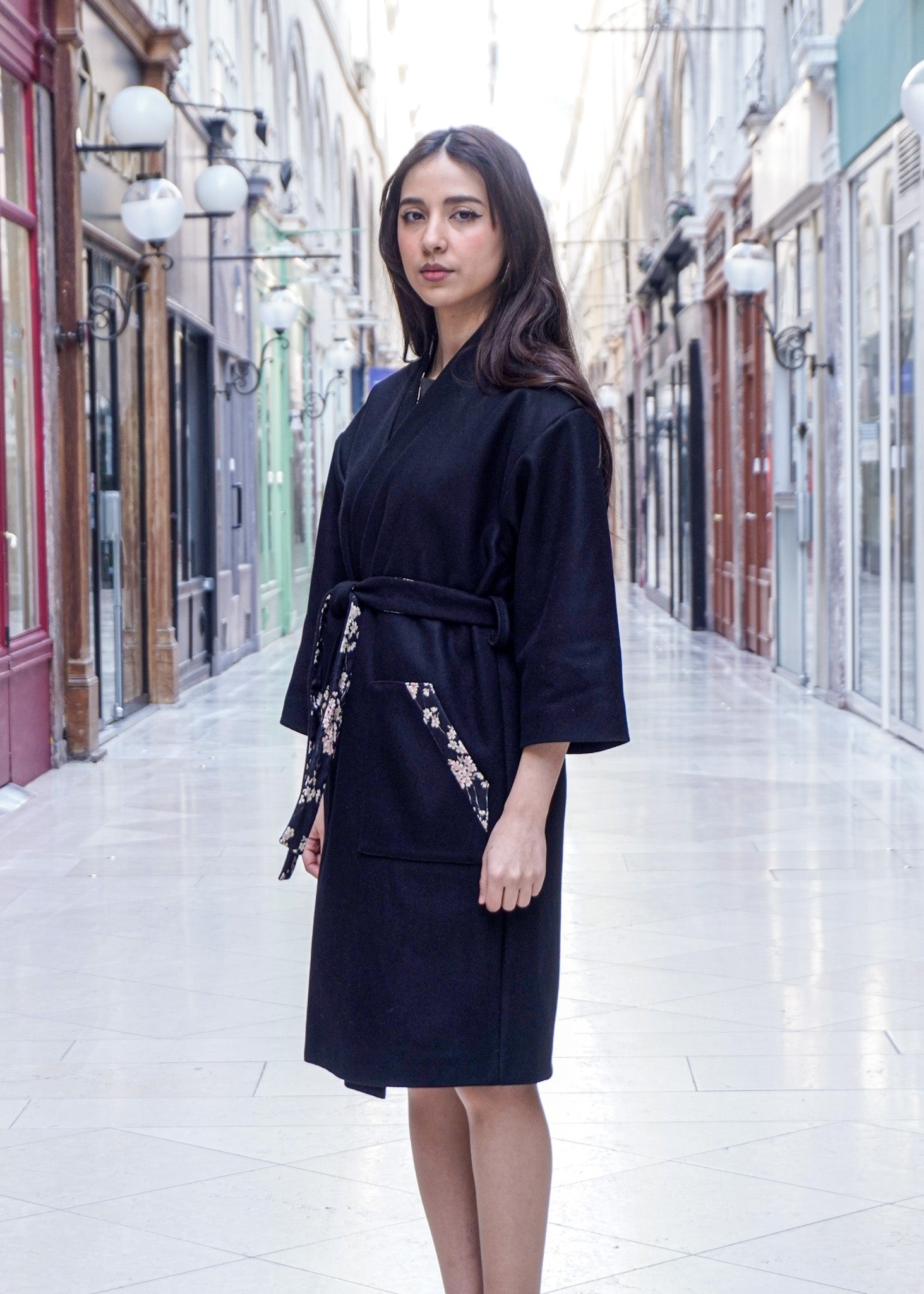 l'imprimé choisi pour ce manteau est un tissu noir décoré de délicates fleurs de cerisiers roses et écrues.