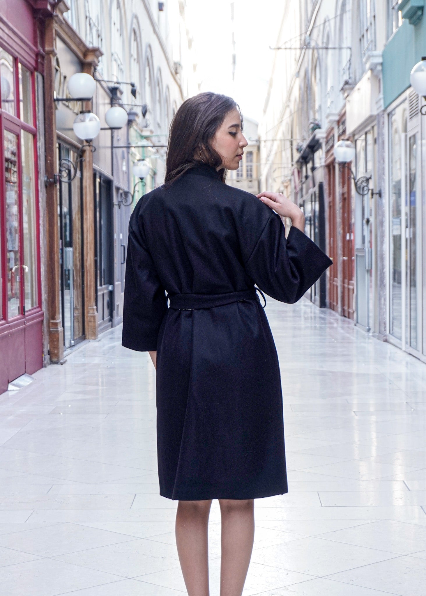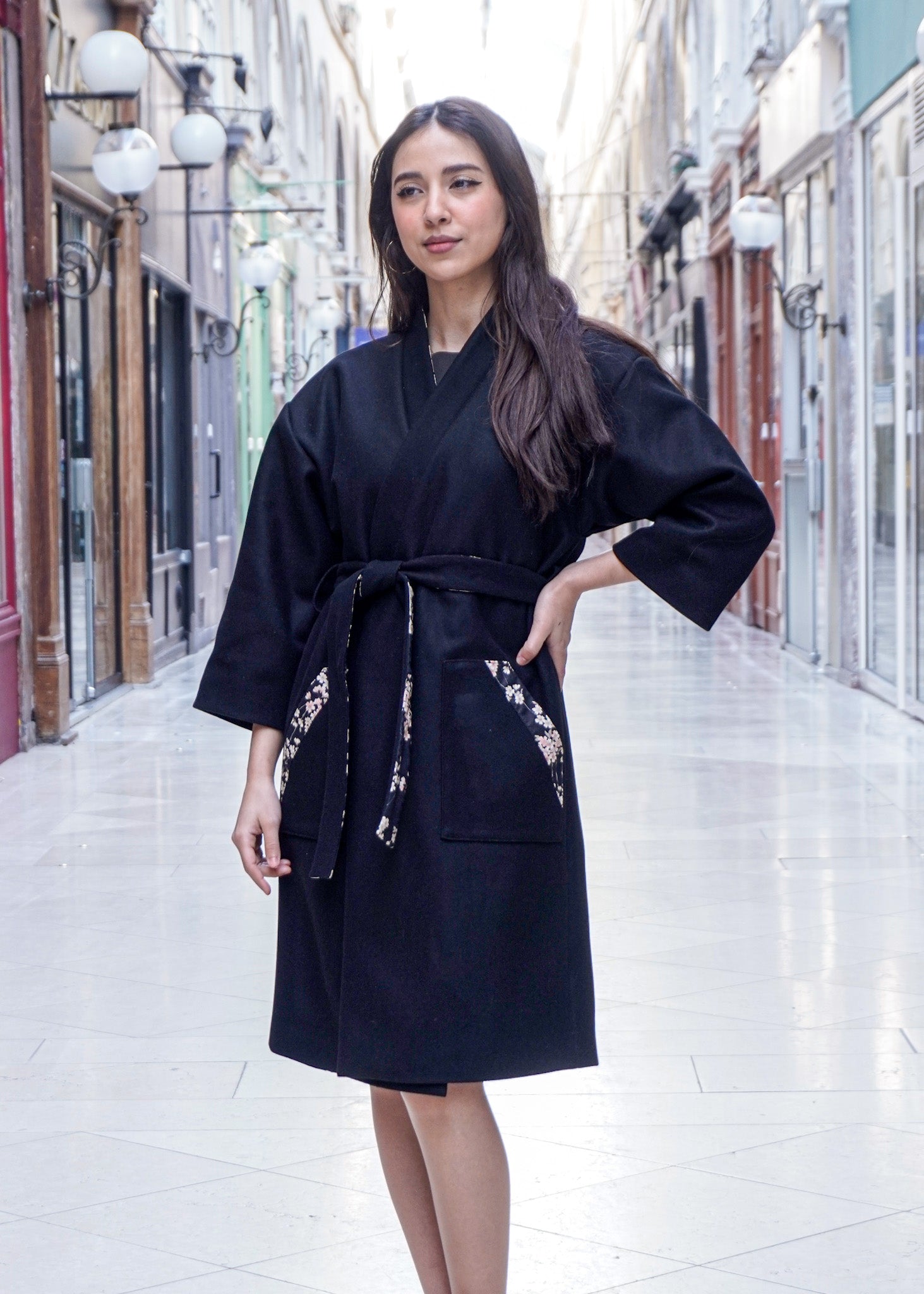 Les détails tels que l'intérieur du col, des manches kimono et les poches sont réalisés en coton japonais, conférant au manteau une touche original, pour un style unique et recherché.