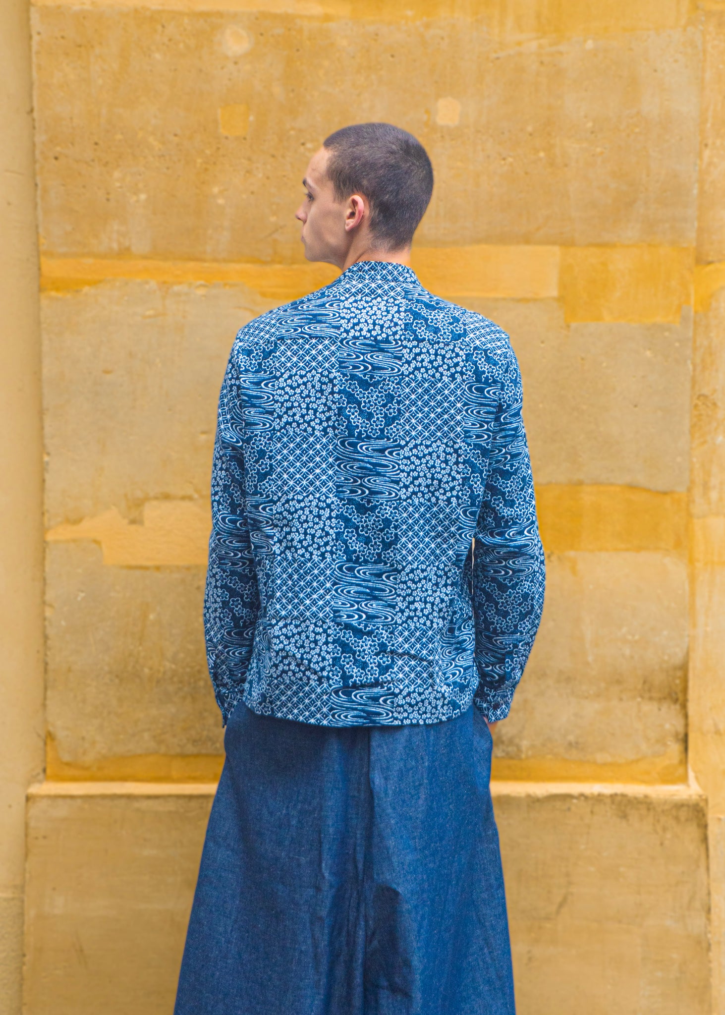 Inspirée des différents motifs traditionnels japonais, cette chemise col officier est confectionnée dans un tissu japonais d'un bleu profond et arbore un motif de fleurs de pruniers, vagues, shippo composant un patchwork. Shippo.