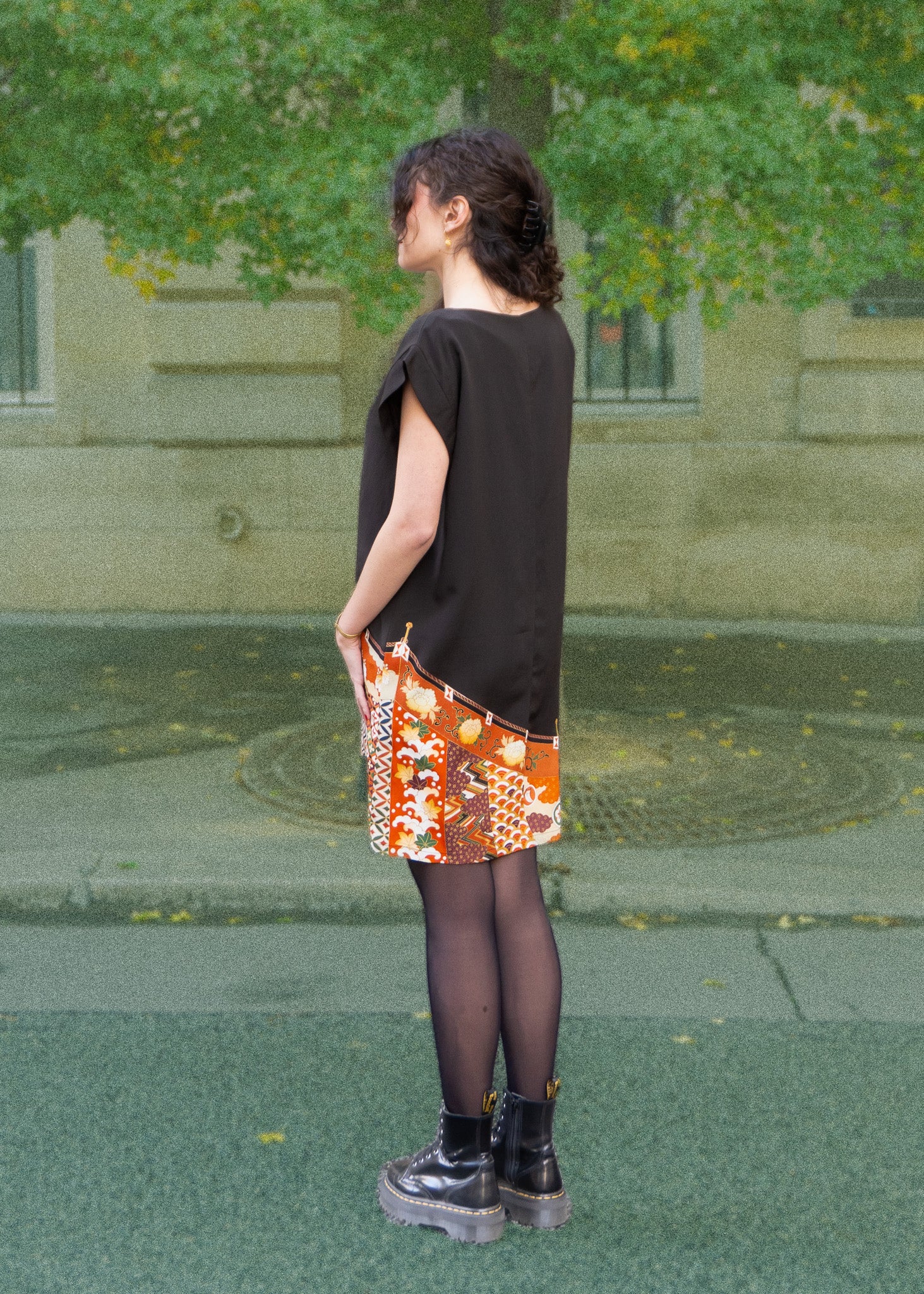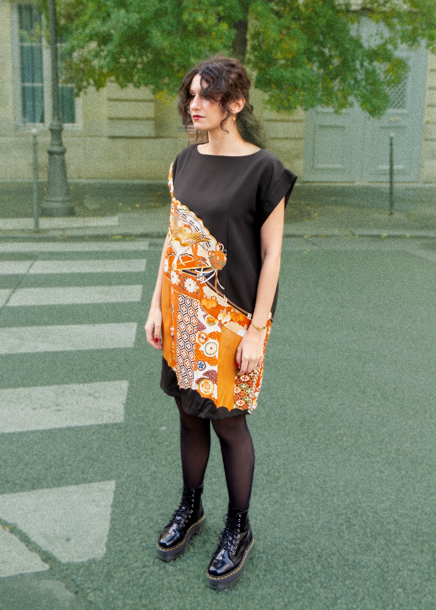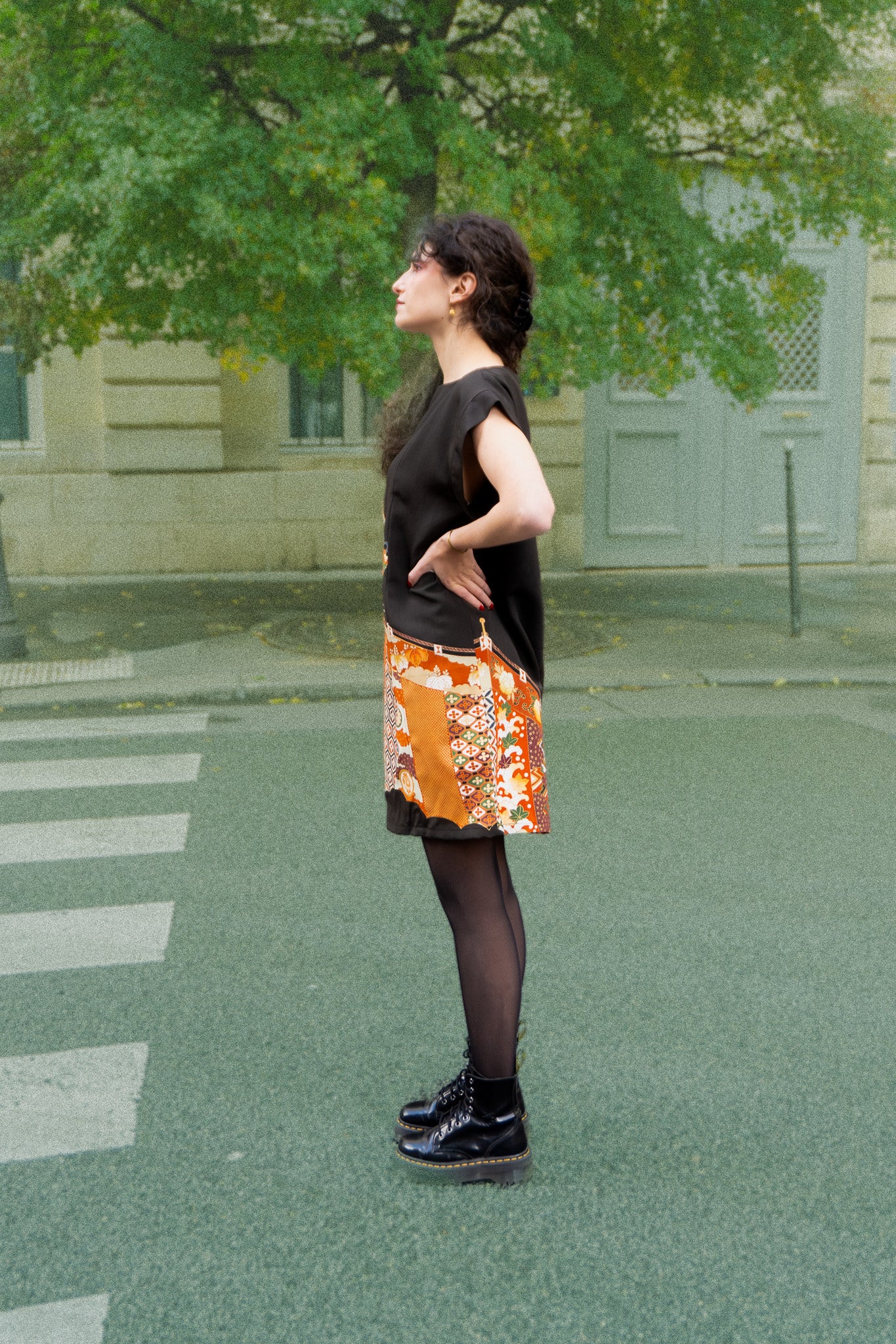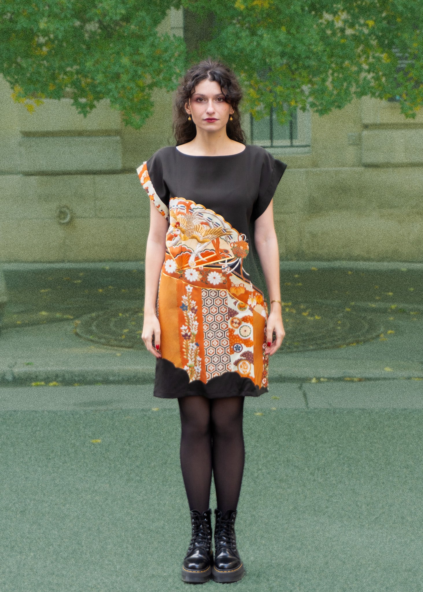 Découvrez cette robe exceptionnelle confectionnée à partir d’un kimono Tomesode japonais authentique. Elle combine la sobriété contemporaine à la richesse d’un savoir-faire ancestral, pour une silhouette à la fois chic et raffinée.